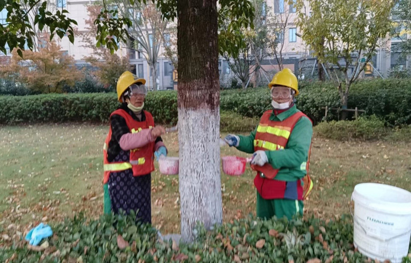 綠化樹(shù)木涂白是園林綠化養(yǎng)護(hù)作業(yè)工作中一項(xiàng)重要內(nèi)容,涂白主要采用石灰、硫酸銅和水混合而成,可以有效減少對(duì)綠化樹(shù)木水分的蒸發(fā),增加綠化樹(shù)木的抗凍、抗病、抗蟲的機(jī)理功能,同時(shí)具備防護(hù)、殺菌、殺蟲的多重作用。為提高綠化樹(shù)木涂白的整體質(zhì)量和視覺(jué)效果,綠化養(yǎng)護(hù)工人采用“拉線涂白法”或“立桿涂白法”,保證涂白上口齊平、高度一致、涂刷均勻,確保綠化苗木涂白后效果與環(huán)境形成美化作用。