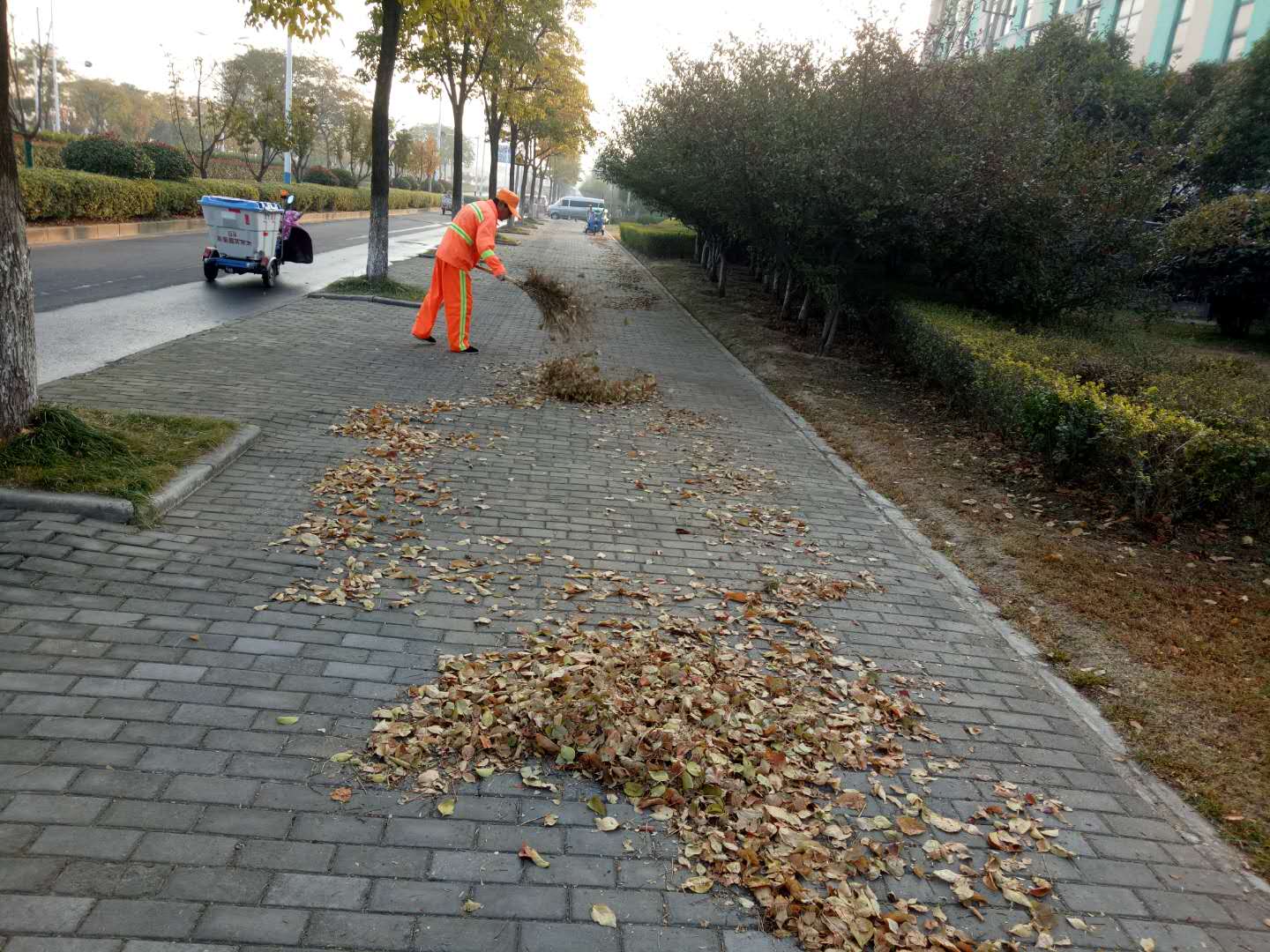 隨著氣溫下降,道路兩側(cè)的景觀樹(shù)植開(kāi)始大面積落葉,環(huán)衛(wèi)工人再次迎來(lái)一年一度落葉清掃“攻堅(jiān)戰(zhàn)”,為了及時(shí)清掃落葉,減少落葉堆積,公司迅速啟動(dòng)清掃預(yù)案,加大對(duì)園區(qū)道路落葉清掃保潔力度。